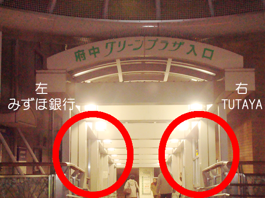 地上から来られる方はケヤキ並木(大國魂神社から府中駅方向に垂直に伸びています。グリーンプラザは府中駅を過ぎた先です。)と甲州街道(国道20号線)の交差点(寿町1丁目交差点)が目印です。向かいがみずほ銀行になります。